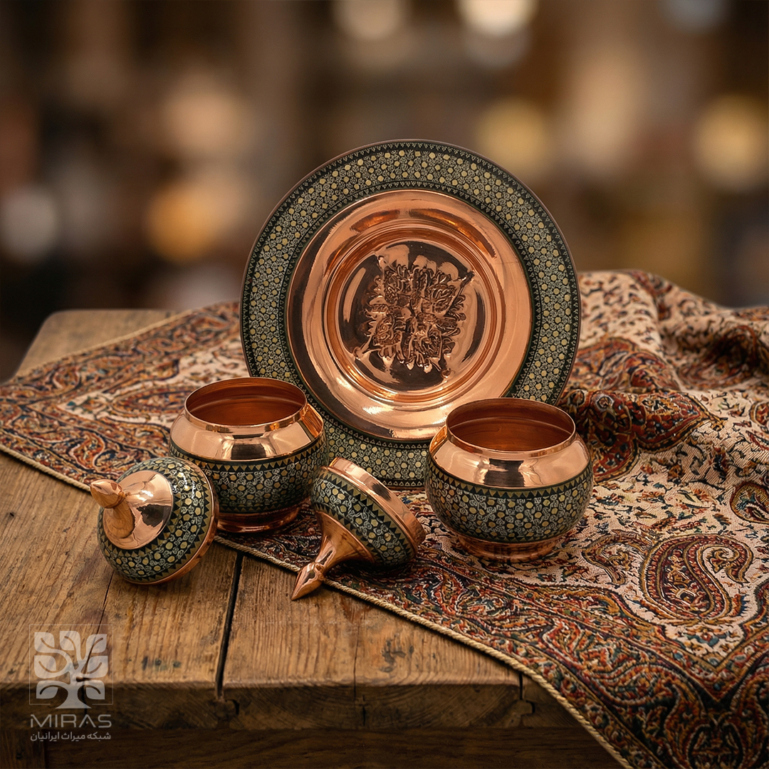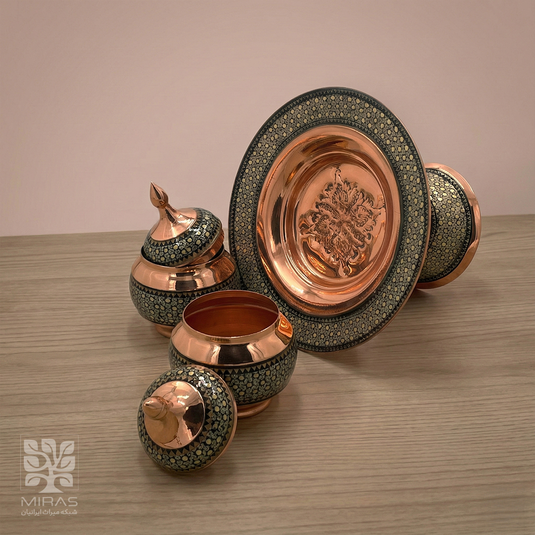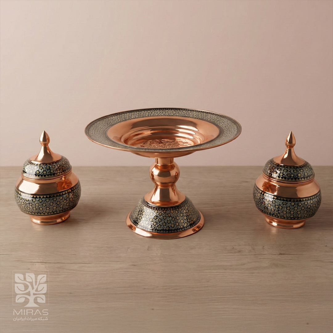 شیرینی خوری لب شبکه ای بسیار زیبای خاتم کاری و قلم زنی شده سایز 2 با هنر خاتمکاری ظریف و ساخت مرغوب، مناسب پذیرایی رسمی و دکوراسیون فاخر.