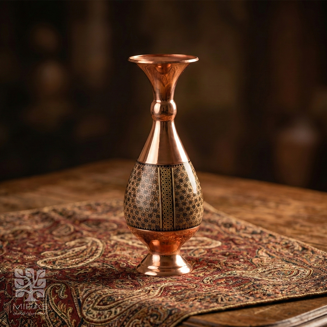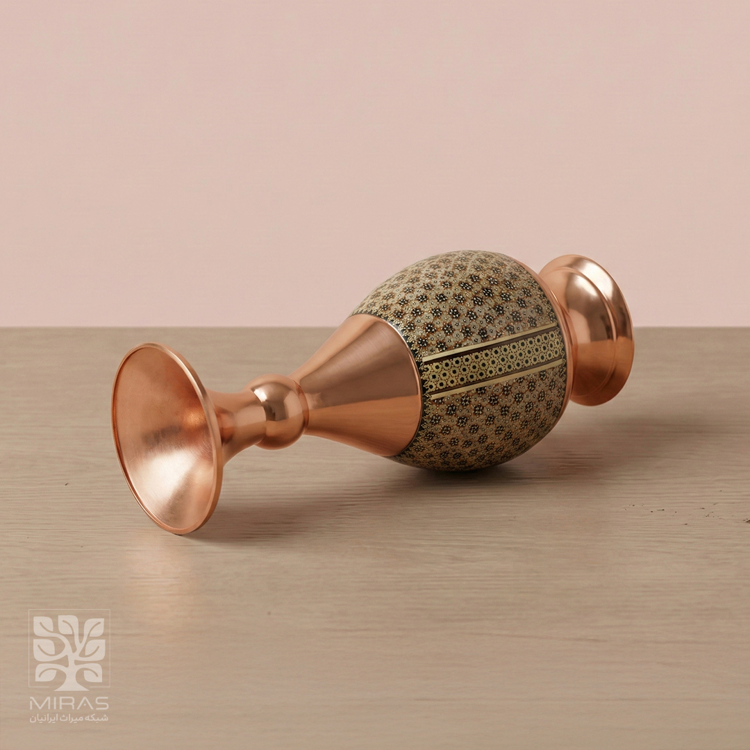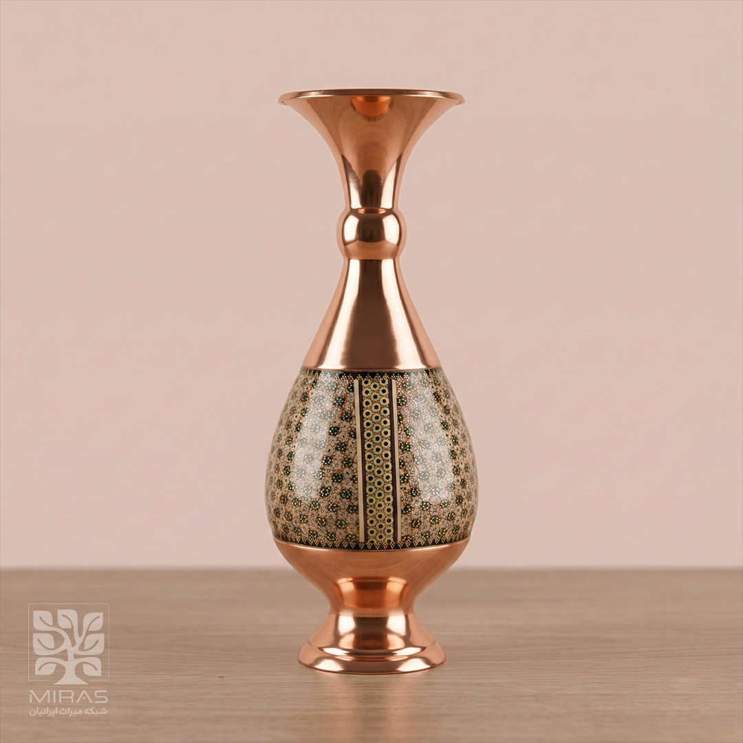 گلدان جفت مس و خاتم خطدار سایز ۲۵ با متریال مرغوب و هنر خاتمکاری اصیل، انتخابی شیک برای دکوراسیون لوکس.
