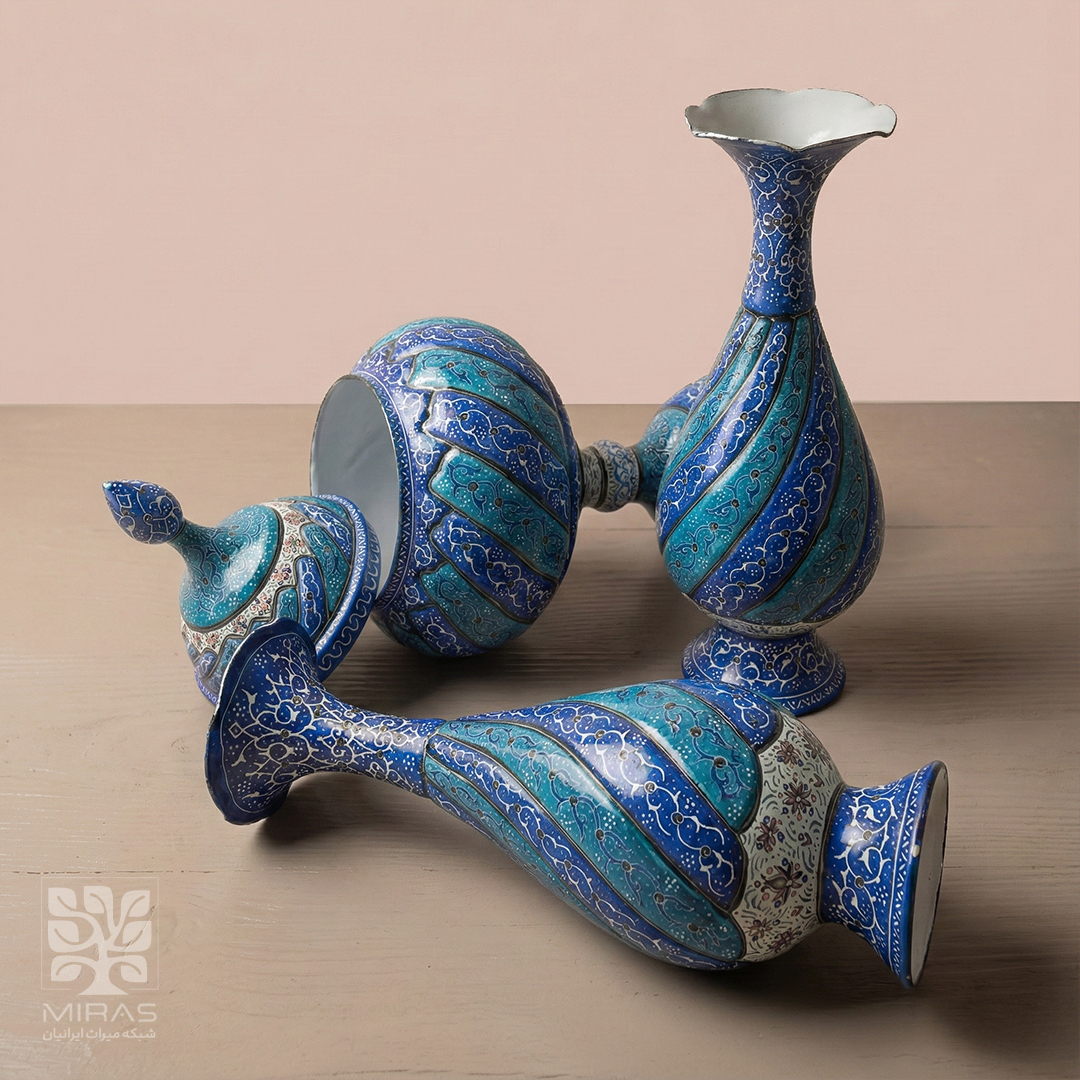ست شامل شکلاتخوری سایز ۲۸ و جفت گلدان میناکاری سایز ۲۵ با ساخت دقیق و متریال مرغوب، انتخابی شایسته برای پذیرایی رسمی و دکوراسیون لوکس ایرانی.