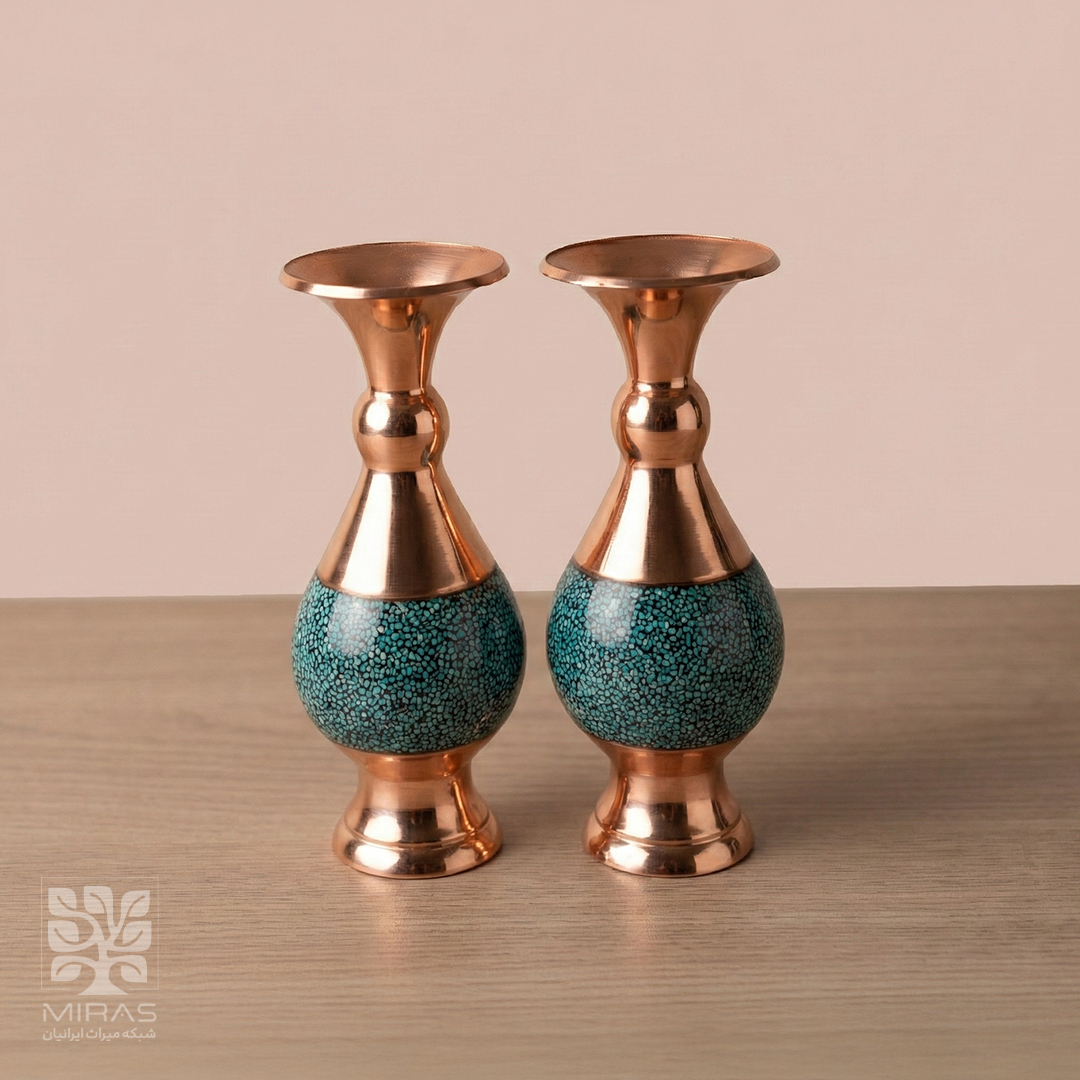 دو عدد گلدان صراحی فیروزه کاری زیبا سایز ۱۶ با ساخت دقیق و متریال مرغوب، انتخابی فاخر برای دکوراسیون اصیل و چیدمانهای رسمی.