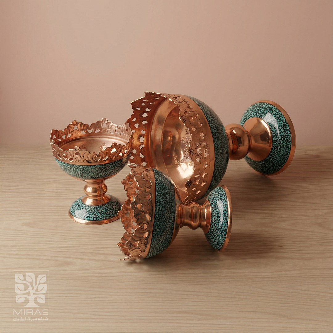 شیرینی خوری لب شبکهای فیروزه با قلمکاری بسیار زیبا سایز 2 با اجرای دقیق و متریال مرغوب، گزینهای شیک برای پذیرایی رسمی و دکوراسیون سنتی.